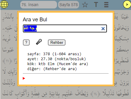 Tepedeki Sayfa numarasına dokununca, başlangıç sayfasına benzeyen bir navigasyon diyaloğu açılır. Bütün arama işlemleri, bu diyalogdaki tek kutuya bilgi girerek yönetilir. Girilen bilgiye bakarak, hangi türden bir arama ya da navigasyon gerektiğine yazılım kendisi karar verir. Yine bu diyalogda, mikrofona söylenen kelimeleri aratmak mümkün. Sesli arama sadece Arapça metin için geçerli.